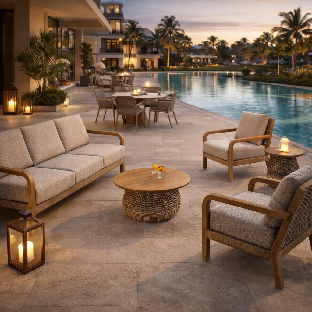 Introducing Cayman our newest deep seating collection. The Cayman line brings effortless sophistication to outdoor spaces. Crafted from solid teak in a warm honey finish, this collection showcases the natural beauty of the wood’s grain while offering exceptional durability for outdoor living. The teak is complemented with straw styled resin in a refined safari tone, adding texture, contrast, and a relaxed character. The combination of solid teak and all-weather resin creates a balanced design that feels both timeless and modern.